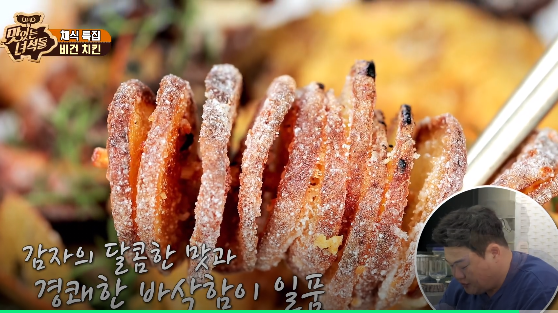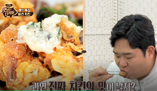 채식특집으로 치킨처럼 보이지만, 실제 육고기가 아닌 비건 치킨 만드는법에 대해 팁이 나옵니다. 1. 압축시킨 노루궁뎅이 버섯으로 치킨과 비슷한 모양을 잡아준다.