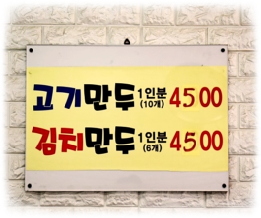 만두가게 메뉴는 기존에는 여러가지 있었는데, 현재는 고기만두와 김치만두만 하고 계시고, 메뉴 가격은 고기만두 1인분(10개) 4,500냥이고, 김치만두는 1인분(6개) 4,500냥입니다.